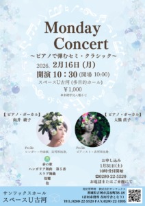 2/16(月)『Monday Concert~ピアノで弾むセミ・クラシック~』を開催します